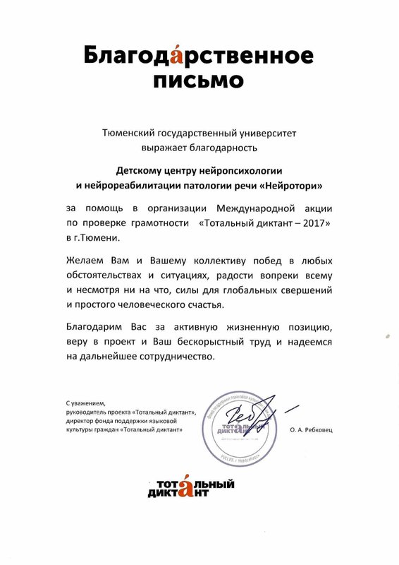Преимущества: Хочу выразить огромную благодарность Тюменскому центру детской нейропсихологии и нейрореабилитации патологии речи «Нейротори»
